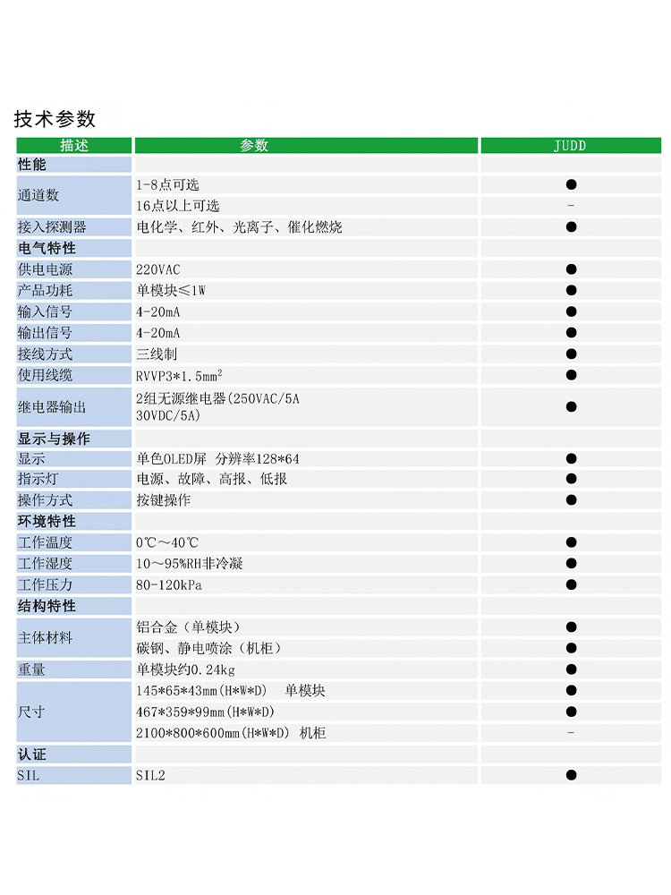 | JUDD型單通道氣體檢測(cè)控制器為標(biāo)準(zhǔn)模塊式控制器,每個(gè)模塊均具備獨(dú)立顯示功能,根據(jù)接入數(shù)量的不同,可分為壁掛式和機(jī)柜式??刂破鲀?nèi)置開(kāi)關(guān)量輸出,可配接4-20mA信號(hào)AG系列有毒氣體,適用于石油、化工、能源、鋼鐵、冶金、燃?xì)獾刃袠I(yè)。 模塊化設(shè)計(jì),點(diǎn)數(shù)自由配接。 OLED圖形顯示,強(qiáng)光下清晰可見(jiàn)。 內(nèi)置開(kāi)關(guān)量,可實(shí)現(xiàn)連鎖控制功能。 鋁合金/碳鋼外殼,堅(jiān)固耐用。 支持接入4-20mA協(xié)議氣體變送器。